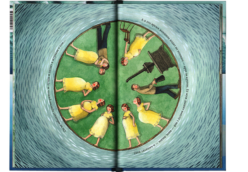 До этой книжки Федя думал, что смотритель маяка просто ходит сюда на работу, поднимается по лестнице каждый вечер, зажигает огонь, а живет где-то в домике на берегу. А он, оказывается, как настоящий отшельник в башне. Впрочем, нет, не отшельник. У него все-таки есть жена, которая приплыла к нему с материка на пароходе. А потом у них появляется дочь, крохотное существо, рожденное на маяке. Когда Федя дошел до разворота, рассказывающего об этом, ему стало немного не по себе. Все-таки тема деторождения – таинственная и напряженная для него, возможно, потому что он самый младший в семье, старшим детям в этом смысле было гораздо проще, младенцы всегда жили в их детском мире. Но автор нашла замечательный ход – нарисовала все это как бы немножечко сверху, в круглой комнате круглой башни маяка. Поменяла привычный ракурс восприятия ‒ и детское напряжение сменилось детским же любопытством. Маячник и его жена с большим животом словно кружились в каком-то необычном танце. Федя крутил книгу по кругу, и влюбленные летели в танце все быстрее. «А где же доктор, который им поможет?» – забеспокоился он вдруг. Доктор далеко, на материке, надо справляться самим. Ничего себе! Но да, так бывает. И все закончилось хорошо. Об этом есть запись в вахтенном журнале.
