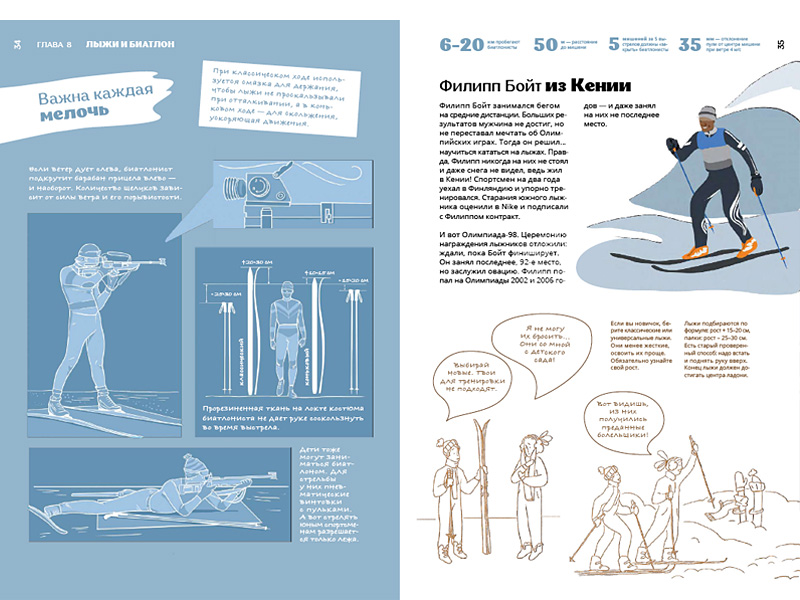 При подготовке иллюстраций художники, кажется, учли все факторы. Это и точные образцы спортивной формы, которые носят спортсмены мирового уровня, и проработанные образы спортсменов в разных видах спорта. Тщательно прорисованы движения, характерные для того или иного вида спорта, красиво нарисованы места тренировок и проведения соревнований, очень похоже изображены великие чемпионы. Даже ради одних только иллюстраций стоит эту книгу читать или просто разглядывать.