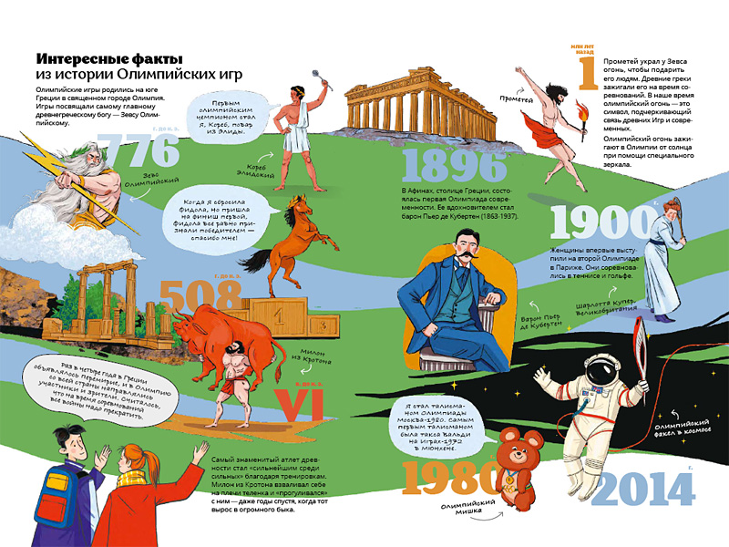 Нельзя не оценить отличную работу книжных художников. Одна из их удачных находок ‒ то, что они везде рисовали реальных спортсменов, известных в истории того или иного вида спорта. А так как это энциклопедия в комиксах, эти герои разговаривают друг с другом, выполняя какие-то спортивные элементы, шутливо комментируют свои действия или обсуждают свою бытовую жизнь. Например, художественные гимнастки сестры Аверины тренируются и при этом спорят, что вкуснее ‒ сыр или колбаса. И в таком же духе общаются или говорят сами с собой и другие известные спортсмены. Их интересно слушать, потому что это реальные люди. Но на иллюстрациях рядом с ними часто мелькают вымышленные персонажи ‒ мальчик Витя и девочка Вика, которые пробуют себя в разных видах спорта и обсуждают это между собой.