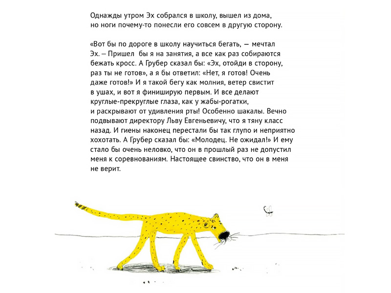 Но неожиданно оказывается, что всему остальному миру, находящемуся за пределами школы гепарда, совершенно нет никакого дела до его школьных страданий. Страус Иммануил искренне удивился – как это можно не уметь бегать, это же так просто! Носорог Фридрих погружен в свои раздумья, земляной волк Густав рад знакомству и совершенно не понимает, почему Эх так печален. А черепаха Блоп вообще не слышал ничего о гепардах и знать не знает, что они должны бегать быстрее всех. И Эх, который сначала пытался в подробностях описывать каждому свое горе, потихоньку отделяется от него, забывает, начинает интенсивно общаться с новыми знакомцами и замечать мир вокруг. А Мышехвост вдруг оказывается просто сном, порожденным бесконечными переживаниями собственных неудач, из которого можно вынырнуть, открыв глаза. В реальной жизни он – обыкновенная летучая мышь, которая взахлеб рассказывает истории о своих многочисленных родственниках. Их так интересно слушать, что гепард боится что-нибудь пропустить и мчится за Мышехвостом изо всех сил. И, конечно, моментально обучается бегу. Потому что в этот момент он не думал, какую ногу поставить первой, не думал, что опять ничего не получится. Он занялся совершенно другим делом.