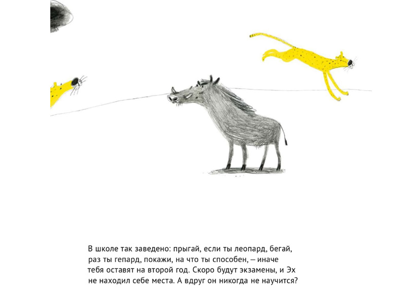 Внутреннее смятение гепарда замечательно передано в иллюстрациях: длинная пятнистая мордашка от страницы к странице склоняется все ниже, глаза становятся все печальнее, длинные ноги разъезжаются в разные стороны. Читатель почти физически чувствует груз тоски на его плечах. В хорошую минуту Эх мечтал победить в соревнованиях, сдать экзамен на «настоящего гепарда», но как только он пробовал, привычный страх поглощал его силы и он не мог сдвинуться с места. Это знакомо многим детям в их школьных буднях – не стоит и пытаться, все равно ничего не получится. Страх неудачи в конце концов превращается в гигантского Мышехвоста, чудовище, готовое преследовать и сожрать маленького леопардика. Грустная история, да.