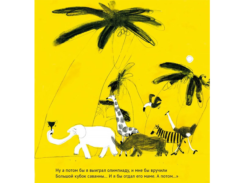 Я очень люблю книжки, которые поддерживают детей в их сложностях, не поучая напрямую, как с этими сложностями поступить, чтобы они исчезли. История гепарда – из их числа. Забавные картинки захватывают, маленький читатель ныряет в текст и внимательно следит за переживаниями гепарда, которые прорисованы всего четырьмя красками – черной, желтой, серой и белой. Их оказалось вполне достаточно, чтобы показать причудливый клубок из страха, неуверенности и желания победить, опутавший сердце главного героя. И первое, что хочется сделать, взяв книгу в руки, – не торопиться ее читать до конца (она легко уместится в один вечер), а хорошенько рассмотреть картинки вместе с ребенком. Мы с Федором поступили именно так, ‒ и почти сразу посыпались вопросы и завязался диалог. Почему на одном из книжных разворотов гигантский Мышехвост нависает над крохотным гепардиком, хотя в жизни гепарды ‒ крупные кошки, а на следующей картинке ровно наоборот – крохотное чудовище улепетывает от гигантского, во весь лист гепарда? Почему никому нет дела до страданий гепарда? Они что, все такие злые, эти звери? А что, если добрая половина его переживаний выросла из его буйного воображения и он боится того, чего вообще не стоит бояться? И почему, собственно, он должен обращать внимание на упреки учителя и насмешки одноклассников?