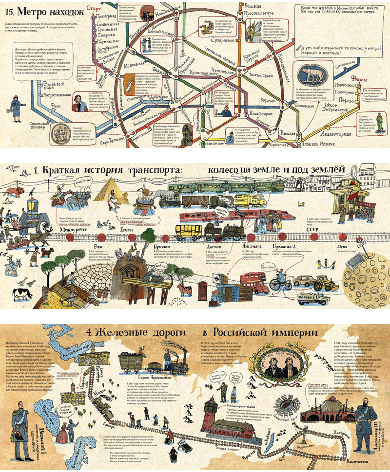 ‒ «Пешком в историю» появилось 11 лет назад. И тогда это было очень странно – заявить себя как издательство познавательных книг по истории. Тогда это было в новинку. Потом, конечно, и многие другие издательства открыли для себя сегмент научно-популярных книг. Но в начале мы были чуть ли не единственные. Я думаю, это было закономерно – ведь во взрослом книгоиздании наметился четкий тренд на доминирование литературы нон-фикшн. По мысли нашего основателя и директора Екатерины Каширской, книги должны были быть разного формата и жанра – рассчитанными на разных читателей. Энциклопедии – да, конечно! Но они должны рассказывать не только о большой истории, а включать темы, до какого-то момента бывшие маргинальными: повседневная жизнь людей в разные времена, в том числе школьное обучение – то, что непосредственно касается ребенка. Жил бы ты в каменном веке, ел бы на завтрак то-то. Жил бы в Древнем Египте, учился бы тому-то… А кроме книг традиционного формата, нужны настольные и «карточные» игры по истории, книжки-«находилки», интерактивные книжки с заданиями ‒ по аналогии со школьными рабочими тетрадями, и т.д. Ну, и исторические повести. Но постепенно мы стали выходить за пределы строго исторических тем. И первым проектом, который вывел нас на новый уровень издательской деятельности, стала книга «Метро на земле и под землей». Для меня этот проект был лично значимым. Среди моих знакомых был мальчик, который очень любил метро и все, что с ним связано. И как же так может быть, что про динозавров книг полно, а о том, с чем ты имеешь дело ежедневно и что действительно так интересно, книг раз-два и обчелся? Но кроме темы, эта книга была еще и необычна по формату – книжка-картинка.