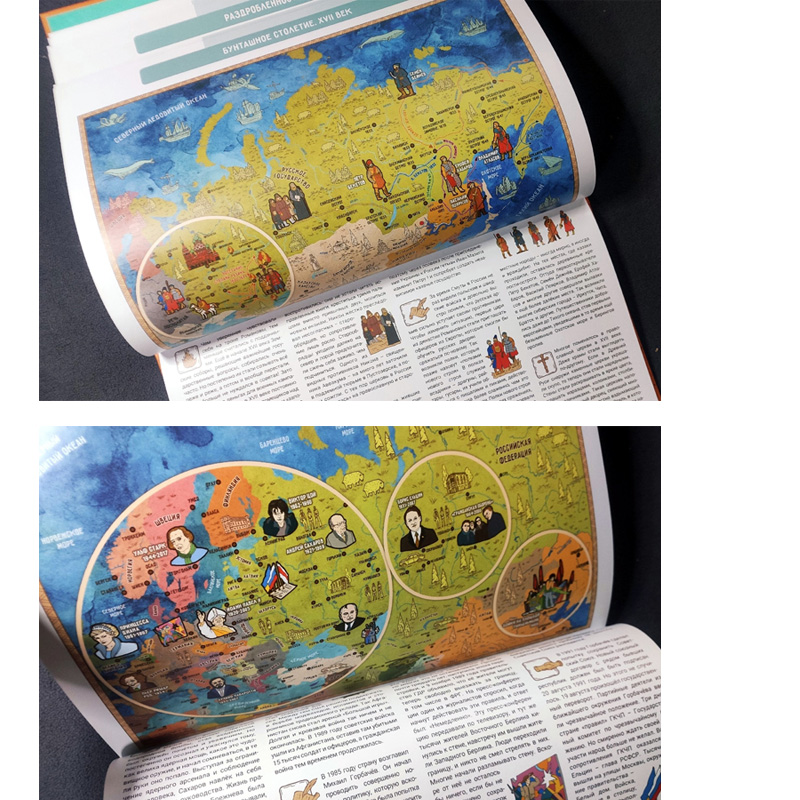 ‒ Нам очень хотелось сделать что-то свое. И я понимала, что такая книжка позволяет решать комплексные задачи. Дело ведь не только в интересных фактах, которые собраны под одной обложкой. Если вам нужны факты, вы можете найти их в Википедии. А книжка-картинка учит читателя сопоставлять ви́дение ученого и ви́дение художника. То, о чем не рассказывает текст, передает иллюстрация, и наоборот. Кроме того, современная познавательная книга позволяет рассказывать о чем-то не только с точки зрения какой-то одной дисциплины, но и комплексно. Или, например, история Отечества сразу помещается в контекст европейской истории за счет используемого формата – у нас, например, вышла прекрасная книга Тамары Эйдельман «Наша эра: история России в картах». За счет того, что карта каждой эпохи включает в себя и соседние страны, возникает наглядное представление о том, что происходило в один и тот же исторический период в разных странах, в разных уголках мира.