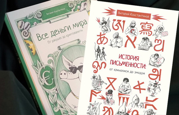 А относительно недавно у нас вышли два познавательных комикса Виталия Константинова: один – про историю письменности, другой – про историю денег. Это своего рода уникальный продукт (а Виталий Константинов ‒ уникальный автор) и по широте освещения темы, и по использованию самых разных элементов в ее графическом представлении: карты, диаграммы, алфавиты и монеты, и тут же забавные персонажи и увлекательные сюжеты.