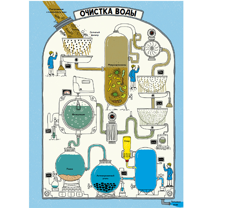 Сын в свои девять лет читал книгу сам. Порой мне что-то приходилось комментировать, но таких моментов было, кажется, всего два (один из них ‒ значение слова «эврика»), так что текст заинтересовал и не вызвал затруднений. Иллюстрации очень простые, не перегруженные деталями и понятные. Они здорово дополняют и поясняют то, о чем рассказывают авторы, ‒ как раз то, что нужно для детской познавательной книги. Действительно, объяснять только словами, как происходит очистка питьевой воды, которую мы набираем в чайник из водопроводного крана, сложно. А вот если использовать для рассказа картинку, похожую на лабиринт, то все понятно.