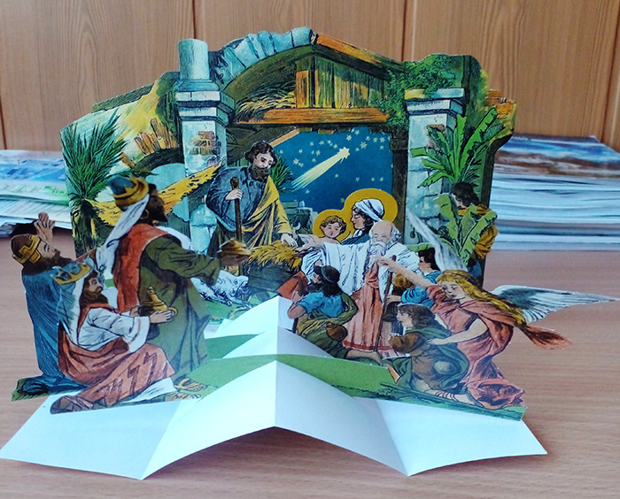 В следующий раз занимаемся рождественским вертепом. Тут можно поговорить и об истории Рождества, и о рождественских традициях, и, конечно, самим устроить вертеп. В картонное основание с прорезями вставляем картинки: святое семейство, пастухи и волхвы. Теперь у нас есть свой рождественский вертеп.