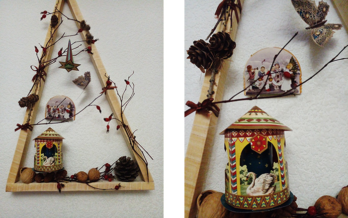 А эти игрушки хочется повесить на елку. Или сделать им необычную елку!.. В следующий вечер мастерим треугольник из дощечек, привязываем и приклеиваем к нему веточки с ягодами шиповника, шишки и орешки, а на ниточках развешиваем наши украшения.