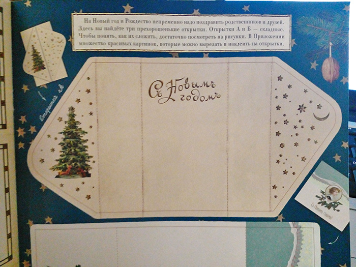 Кажется, осталось выбрать пару поздравительных открыток. Здесь есть складные заготовки с надписями, а в приложении ‒ большой набор «прехорошеньких», как сказано в тексте, картинок: ангелочки, старинные часы, вертолетик, корзинки с цветами, нарядные барышни и дед Мороз. Интересно, что выберет Сережа?..