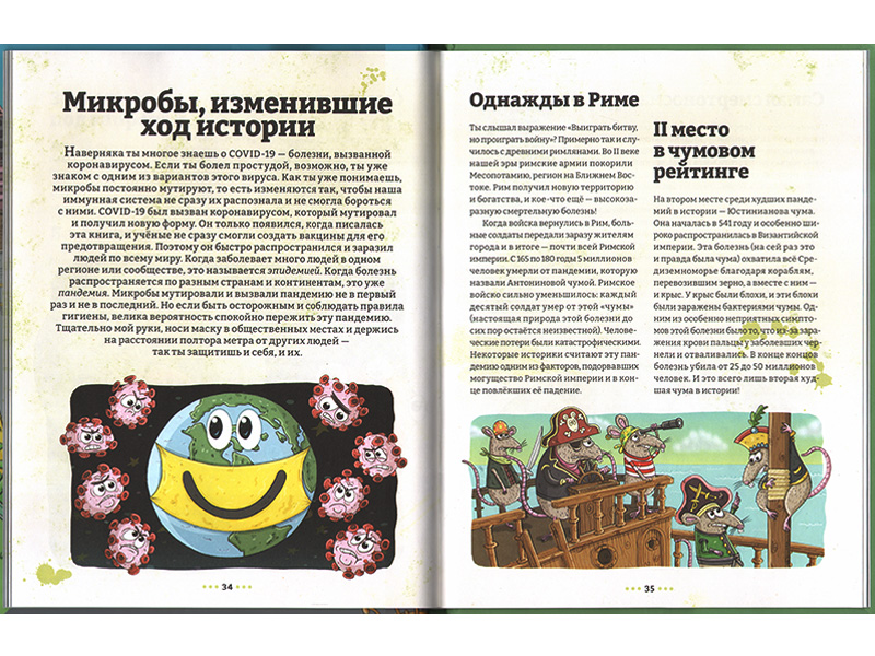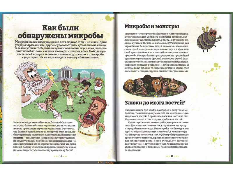Из второй части ‒ «Как были обнаружены микробы» ‒ я узнала о том, что думали о микробах люди в древности. Оказалось, что древние греки считали причиной заболеваний гнев бога Зевса, который не может простить людей за то, что они получили огонь. А ещё в этой части рассказывается о том, кто и как открыл микробов. О некоторых великих ученых я уже знала – про Левенгука, открывшего существование микробов, и про Коха, который доказал, что микробы и вызывают болезни.