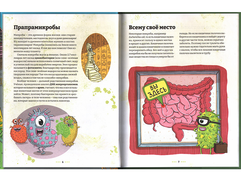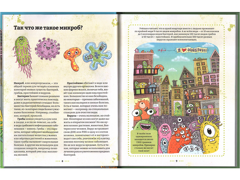 Художник Майкл Шиелл изобразил «героев» книги как весёлых и дружелюбных инопланетян со множеством глаз и лапок. Но теперь я знаю, что на самом деле большинство микробов не такие уж и дружелюбные. Хотя мне бы хотелось, чтобы микробы были и в жизни такими же смешными, добрыми и яркими существами.