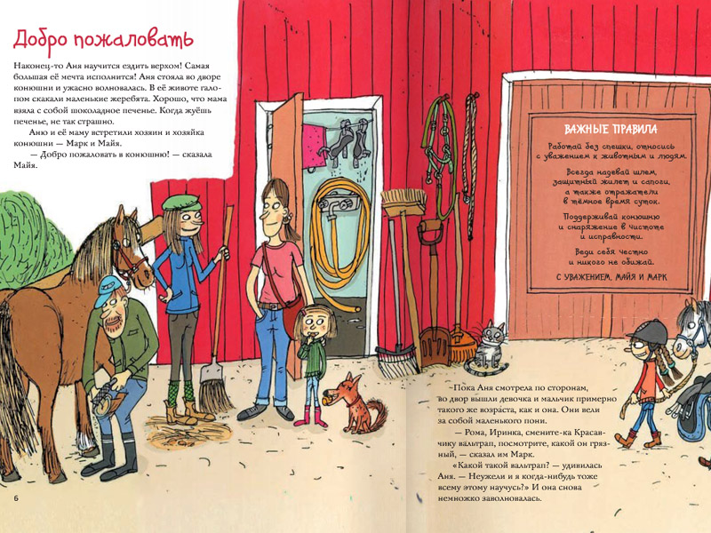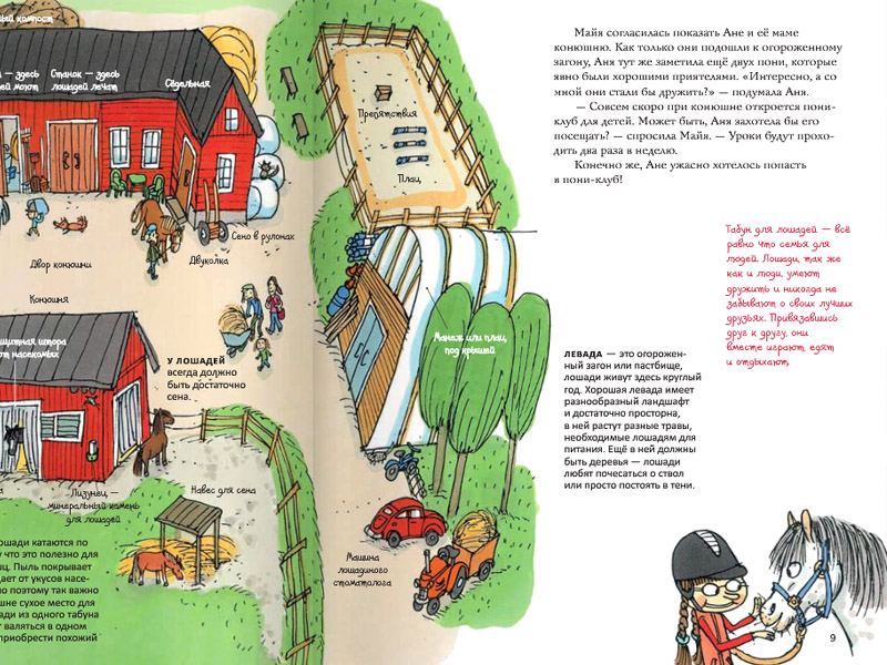 В отличие от многочисленных тематических энциклопедий, в том числе на «лошадиную» тему, «Аня идет в пони-клуб» – рассказ о цикле детских занятий в пони-клубе. Начинается он с того, как мама приводит Аню в конюшню на Еловой горке и знакомит с хозяевами, Майей и Марком. «Наконец-то Аня научится ездить верхом! Самая большая ее мечта исполнится! Аня стояла во дворе конюшни и ужасно волновалась. В ее животе галопом скакали маленькие жеребята». Аня становится участницей детской группы. Каждый из ребят описан кратко, но очень ярко: Иринка скачет, словно белка, Рома всегда готов помочь. Переводчик Анна Сидорова русифицировала все имена детей, и это позволяет маленьким русскоязычным читателям намного легче запоминать их и следить за отношениями детей и лошадей.