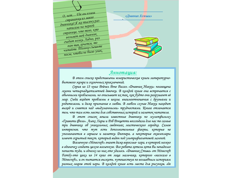Серия из 13 книг Рейчел Рене Рассел «Дневник Никки» посвящена жизни четырнадцатилетней девочки. В каждой книге она встречается с обычными проблемами, но описывает их так, как будто они разрушают её мир. Это проблемы в школе, взаимоотношения с друзьями и родителями и даже признание в любви. В любом случае, Никки находит выход и смеется над «выдуманными» трудностями. Книга отличается тем, что в ней есть места для собственных историй и заметок читателя.