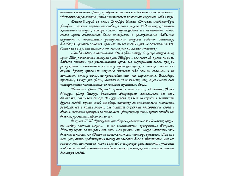 Главный герой книги Джеффа Кинни «Дневник слабака» Грег Хемфли – самый неудачливый слабак в своей школе. В дневниках описаны жизненные истории, которые могли происходить и с читателем. Из-за этого книги становятся более интересными и увлекательными. Забавные картинки и постоянные риторические вопросы задают динамику, благодаря которой хочется прочитать все книги серии не останавливаясь. Смешные ситуации заставляют взглянуть на жизнь по-новому.