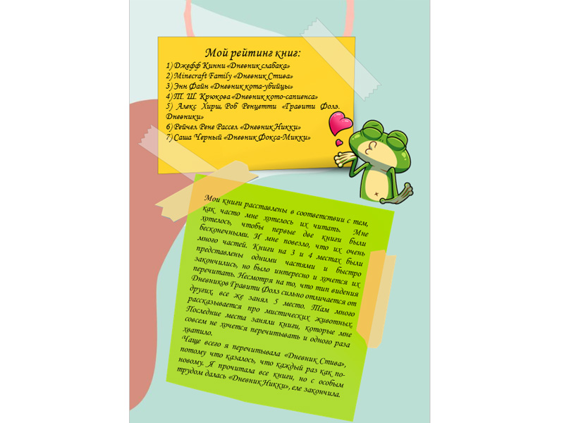 Здесь книги расставлены в соответствии с тем, как часто мне хотелось их читать. Мне хотелось, чтобы первые две книги были бесконечными, и мне повезло ‒ там очень много частей. Книги на 3-м и 4-м местах быстро закончились, но мне было интересно и хочется их перечитать. Несмотря на то, что тип видения в «Дневниках Гравити Фолз» сильно отличается от других книг, все же они заняли 5 место, ‒ там много рассказывается про мистических животных. Два последних места заняли книги, которые мне совсем не хочется перечитывать, одного раза хватило.