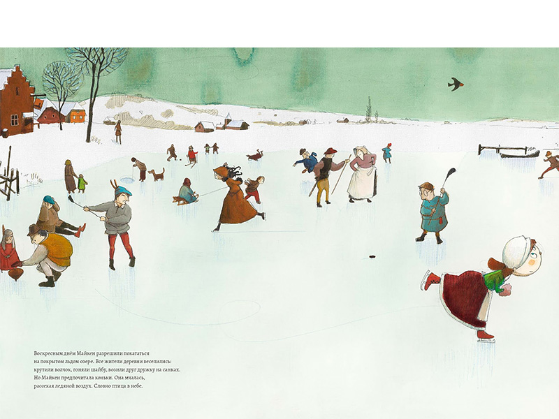 В книге присутствует историческая атмосфера. Главная героиня с малых лет вовлечена в работу семьи, по воскресеньям она отдыхает и катается на коньках (как персонажи картины Брейгеля). На озеро она идет одна, без родителей, и после катка возвращается домой по той дороге, которую сама выбирает. Это не похоже на современность, и дети-читатели сразу отмечают, что раньше всё было иначе. Мать девочки много трудится и сильно устает, поэтому ее никак нельзя назвать ласковой. Но, с другой стороны, кто еще, как не мама, мог отправить на поиски Майкен охотников с собаками? Ведь если бы не они, девочка могла бы замерзнуть в снегу.