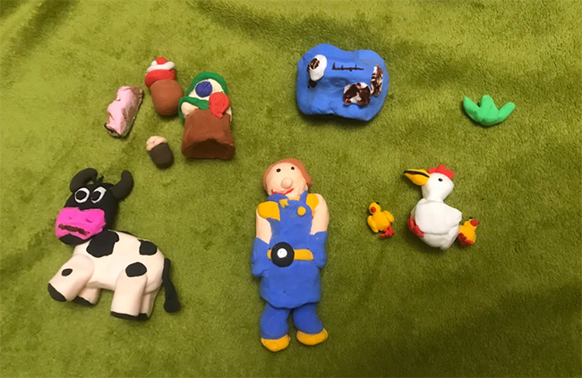 Фигурки, которые можно слепить из пластилина или найти среди игрушек: голубой автомобильчик, один или несколько рабочих, корова, курочка с цыплятами, мороженое и магазин мороженого, дерево.