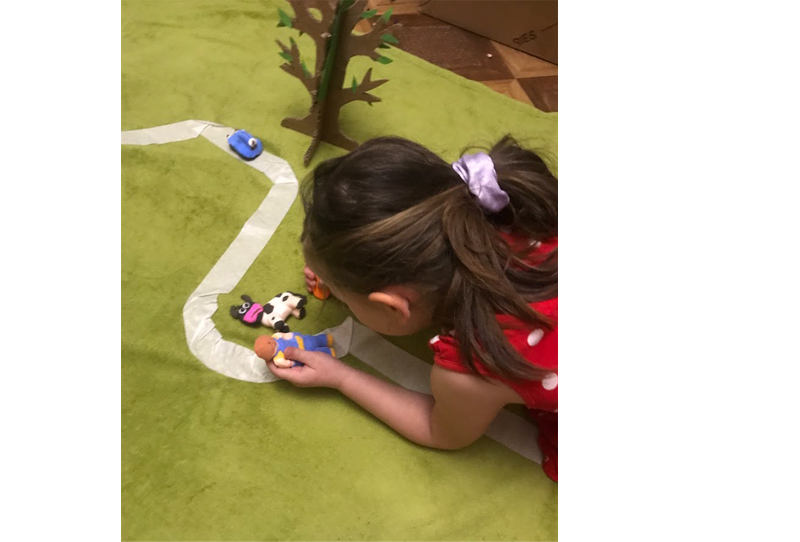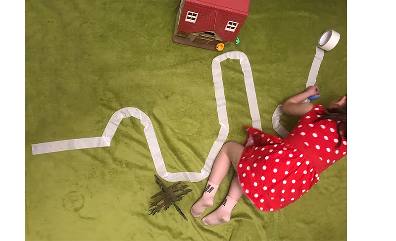 Перед тем, как показать историю зрителям, ребенок сам изучает историю, которую рассказал автомобильчик, строит дорогу и делает на ней повороты с помощью бумажного скотча.