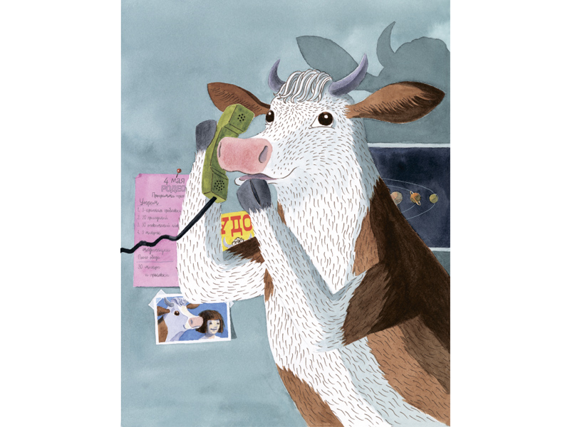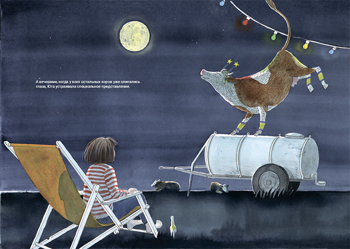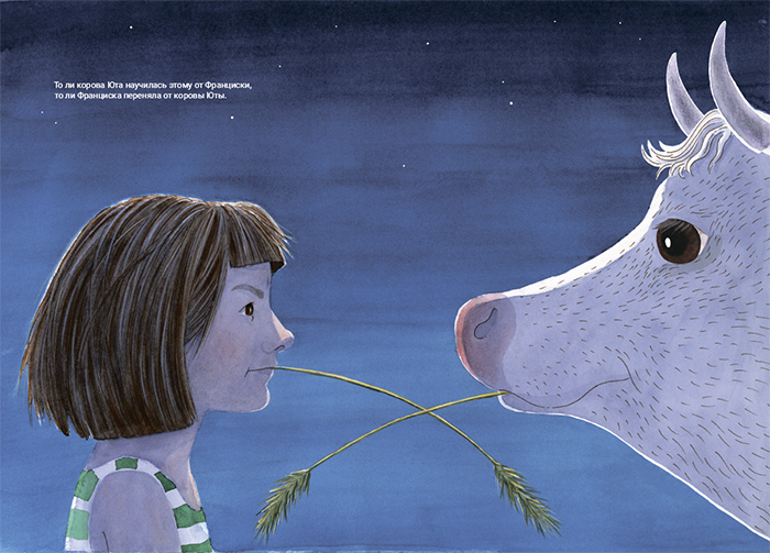 И конечно, у Юты появляется подруга – девочка Франциска. На удивление всем коровам Юта не перестает с ней дружить, даже когда из теленочка превращается в корову. У них много общего: обе любят петь и отличаются строптивостью. О таком качестве Сережа еще не слышал, но, улыбаясь, отмечает, что тоже обладает смелостью перечить старшим и сестре. Мне интересно, как разграничить вредность и строптивость. Но следующий разворот с изображением звездной ночи и смотрящих друг на друга подруг Юты и Франциски убеждает нас в том, что у героев есть внутренний мир и мечта. Это и дает им смелость отстаивать свой путь и перечить некоторым окружающим.