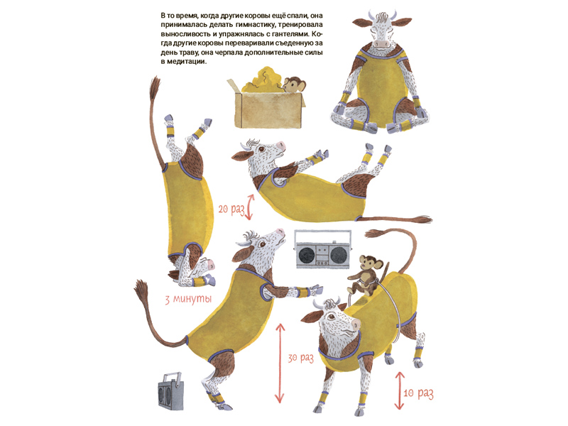 А Юта не отступается от своей мечты и решает тренироваться. Сережа, глядя на картинки, пытается повторить некоторые упражнения, которые делает Юта: приседания, на развитие пресса и прыжки. А вот стойка на голове у него никак не получается. Мы решаем, что лучше продолжить чтение и вообразить, какие представления вечерами устраивает корова специально для своей подруги. Любимая иллюстрации Сережи – выступление Юты на цистерне с молоком.