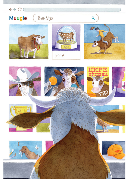 Корова Юта мечтает выступать в цирке, но узнает, что местных животных туда не берут. Ей нужно или отказаться от мечты, или доказать, что она может сделать что-то невиданное – например, как бык Удо, звезда родео. Сережа оценивает юмор художницы Ханны Цекау, которая изобразила страничку быка в интернете: Muuqle. Он внимательно рассматривает нарисованные фотографии, особенно те, на которых Удо изображен в шляпе.