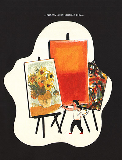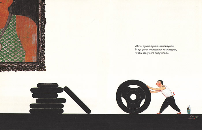 Родственники страшно недовольны, что потомок не хочет идти их чемпионской дорогой. Только он совсем не слабак и не лентяй, он нормальный жизнерадостный мальчик. Просто ему интересно другое: через пару страниц мы видим Абтина с кисточками и мольбертом. Здесь он улыбается во весь рот – краски приносят ему настоящее счастье. А родные чемпионы мечтают лишь о продолжателе династии, еще с колыбели решив за мальчика его судьбу. Все должно быть подчинено достижению цели, даже еда и сон, не говоря уже о строгом ежедневном расписании занятий…