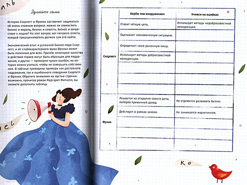 Важно, что книга «Деньги в руках литературных героев» даёт читателю возможность ещё и самому подумать о решении проблем героев. И я этой возможностью пользовалась: решала задачи и подсчитывала убытки и прибыль Раневской в пьесе Антона Чехова «Вишнёвый сад» и Смока и Малыша в рассказе Джека Лондона, дополняла таблицу достоинств и недостатков Скарлетт и Фрэнка, героев романа Маргарет Митчелл «Унесённые ветром», и перед тем как читать раздел «Чем дело кончилось?», я сама пыталась предположить, что получится в итоге (только по тем произведениям, которые я не читала).