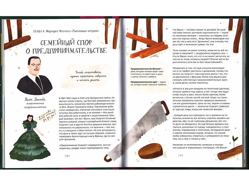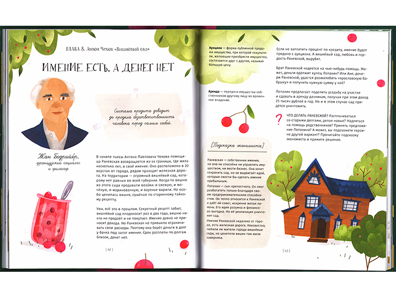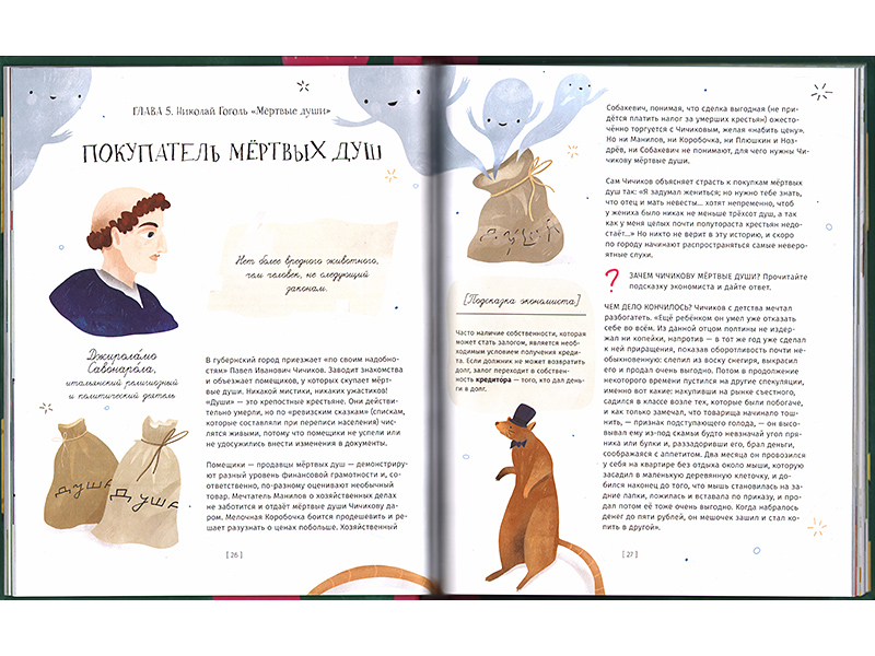 В книге «Деньги в руках литературных героев» рассказывается о разных ситуациях с финансами, в том числе в классических произведениях. Например, когда я в школе проходила повесть Пушкина «Дубровский», мы в классе обсуждали момент, когда богатый помещик Троекуров нечестным образом отобрал у Дубровского его поместье, чтобы отомстить ему. Троекуров дал судьям взятки, чтобы они приняли решение в его пользу. Но оказалось, что и сам Дубровский был в какой-то степени виноват в том, что с ним произошло, так как не держал свои документы в порядке – даже если они и сгорели при пожаре, можно было восстановить их, и тогда было бы гораздо труднее отобрать у него фамильное имение.