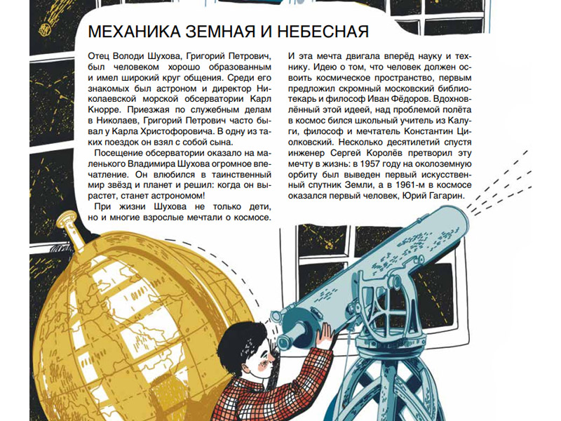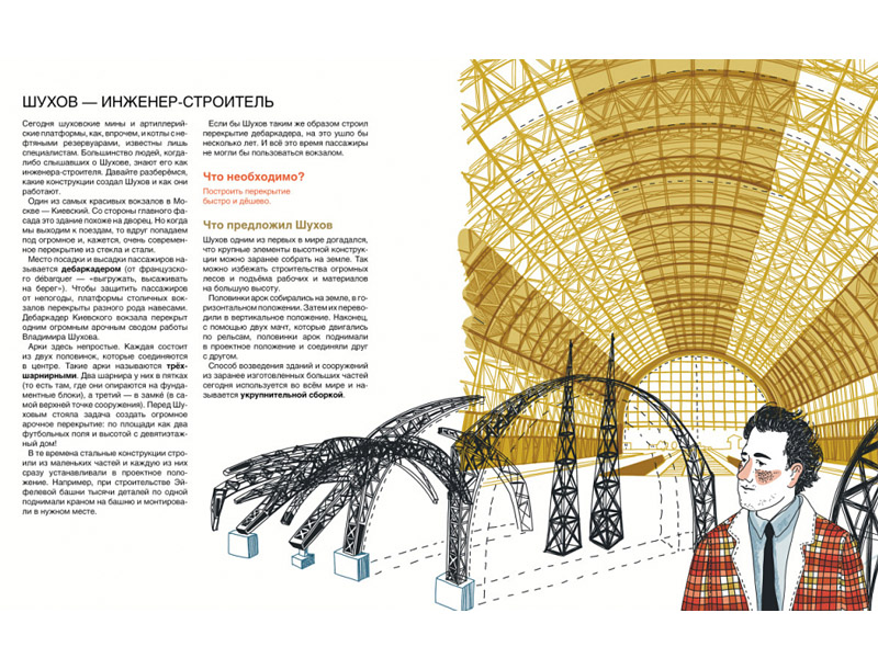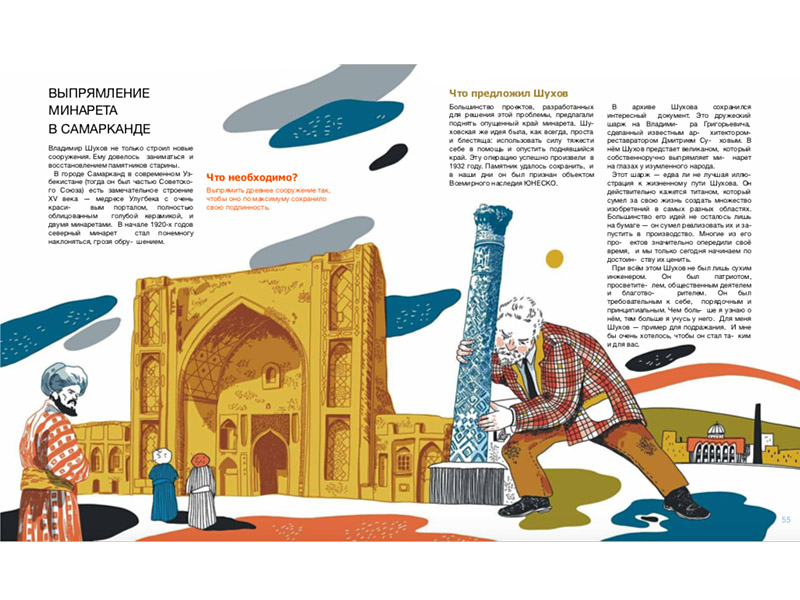 Владимир Шухов проявил себя в разных областях науки, он активно применял свои знания и использовал наблюдения за природой в строительстве и инженерном деле. Нам очень понравились главы о том, как он работал с нефтью, рассказ о паровых котлах системы Шухова и строительные истории. Было здорово попробовать сделать маленькое подобие Шуховской башни своими руками, как это предлагает автор книги. Но особенно нас удивил проект по выпрямлению минарета времен Улугбека в Самарканде, ведь это было не строительство с нуля, а исправление изменений, которые произошли за века, и Владимир Шухов блестяще справился с поставленной задачей.