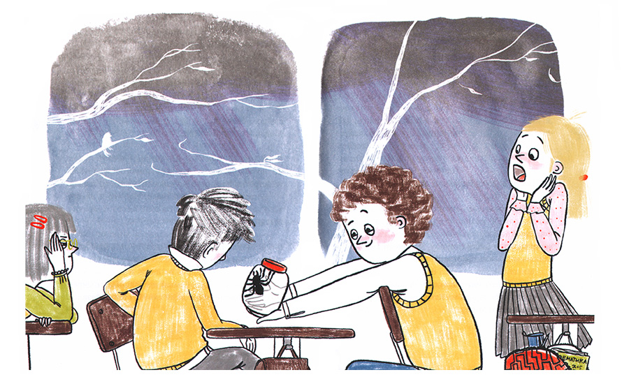 Однажды мальчикам даже приходится провести небольшое детективное расследование. Миша принёс в школу большого, пушистого и с виду довольно страшного паука-птицееда в банке (не подумайте, что он хотел его выпустить и всех напугать, нет). Он показал его Жене и убрал банку в рюкзак. Но на перемене кто-то открыл Мишин рюкзак, достал банку с пауком, открутил крышку и выпустил паука на волю. Кто этот «кто-то», и предстояло выяснить мальчикам.