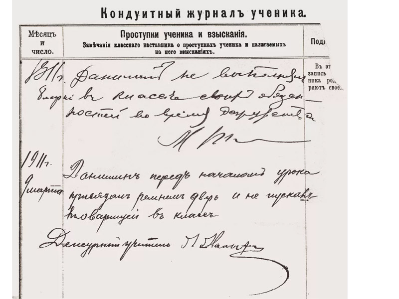 В кондуит заносились провинности гимназистов. Провинностью считалось любое нарушение правил. А правила были очень строгими. Они, например, жестко регулировали прогулки гимназистов и возможность посещать общественные места.