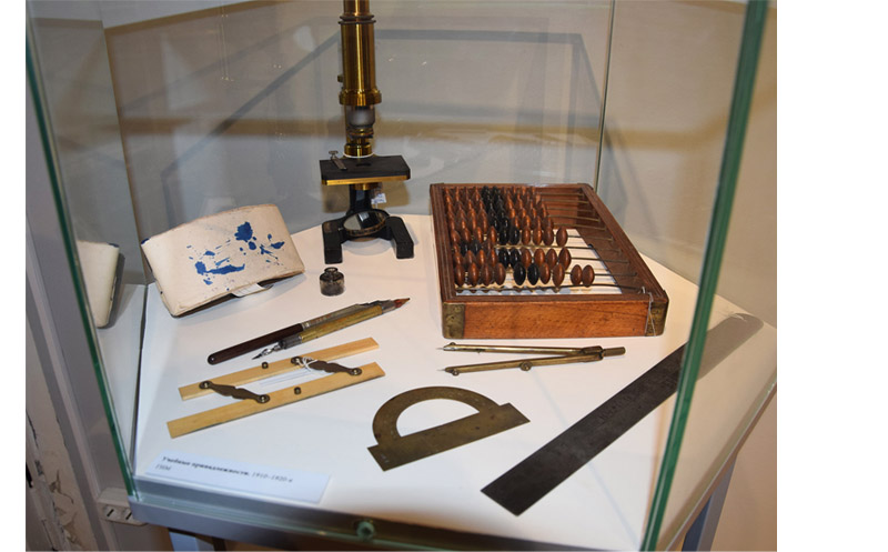 Здесь представлены учебные принадлежности, которые нужны были гимназисту начала прошлого века.