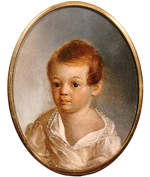 Это портрет работы художника Ксавье де Местра. Тут Пушкину около двух лет. Обратите внимание на фон — голубой и розовый. Почему художник выбрал такие цвета для портрета?