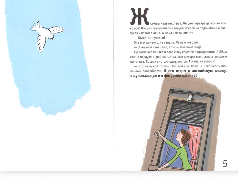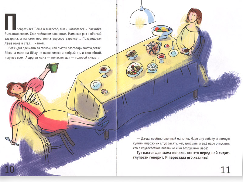 Леша – необычный мальчик. «Хочет – с ласточками полетает, а мама даже не волнуется, потому что знает – «это совершенно не опасно». Хочет – превратится в летающую тарелку, чтобы помирить влюбленных, или в маленькую девочку – чтобы такую же маленькую девочку спасти от похитителей. А то превратится в начальника маминого начальника, сами догадайтесь зачем. Но Лёша своего добился, теперь мамин начальник вообще на мам не кричит, «только на пап».