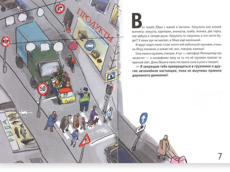 Всего и не перечислишь, одна история лучше другой. Правда в грузовик мама ему превращаться запретила – пока не выучит правила дорожного движения. И разминирование Думы не одобрила – слишком опасно (и тут без Лёши никак, ведь только он может превратиться в самого лучшего специалиста, а настоящий самый лучший специалист как на грех улетел на недельку в Америку, «чтобы там поучиться и стать еще лучше»). Но Лёша, конечно, не послушался, Думу разминировал. Вернулся домой, как ни в чем не бывало, сидит себе за столом, гречневую кашу ест, только на груди медаль поблескивает. «Тут мама все поняла, но ругать Лёшу не стала, а вышла на балкон и тихонько всплакнула. Сначала от страха, а потом от радости: все-таки разминировал!»