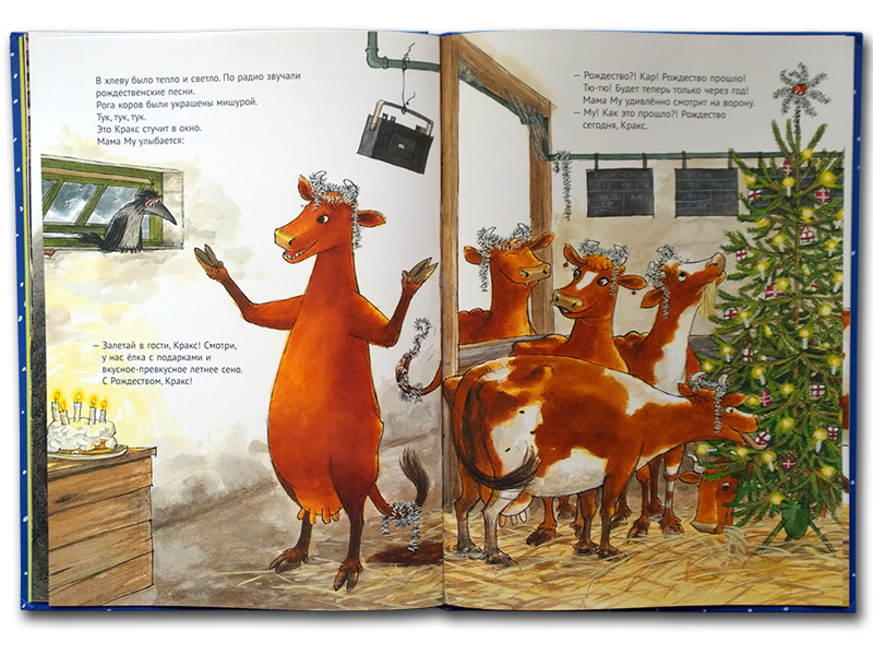По детальным иллюстрациям Свена Нурдквиста можно с легкостью воссоздать любую историю. А в книге «Мама Му и Рождество Кракса» нам особенно нравится разворот с изображением коровника, где Кракс – вернее несколько его изображений – от удивления, что приближается Рождество, носится и поднимает вихри воздуха. Еще множество маленьких Краксов, которые сами себе упаковывают подарки. Рассматривать иллюстрации и читать короткие и точные предложения Юи Висландер – особое наслаждение: «Наступила зима. Дом и двор замело снегом». Точнее тут и не скажешь.