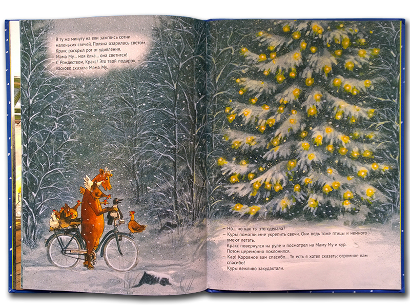 Тихо падают снежинки. Сверкает и переливается елка. В такие моменты хорошо думать, что у каждого в это волшебное время будет подарок, а Мама Му, если как следует попрыгать, непременно собьет молоко в сливки.