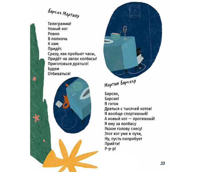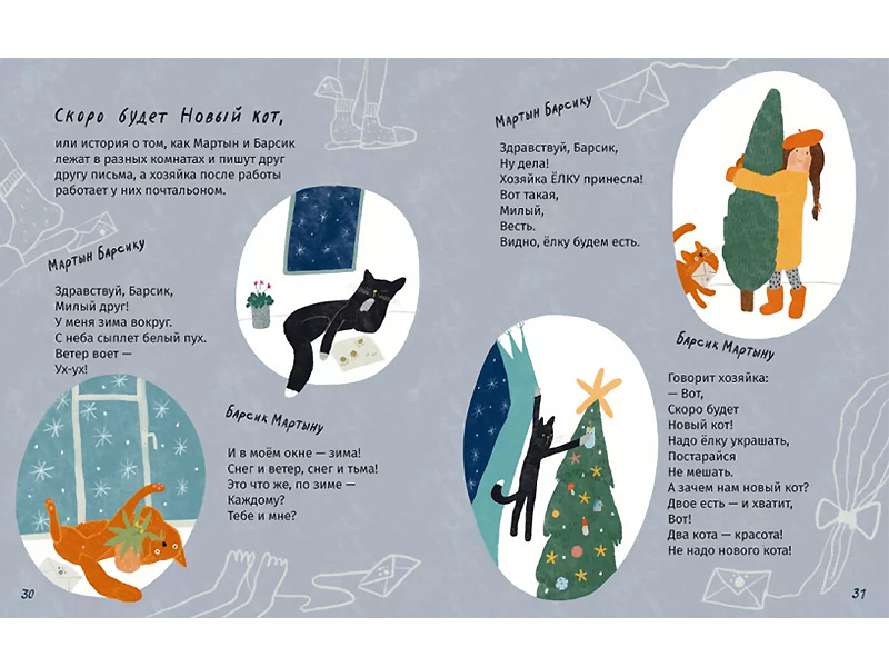 Отдельный восторг – новогодняя переписка котов. Каждый котовладелец знает – в новогодний вечер елка непременно будет опрокинута. Маша Рупасова создает из этого знания целую новогоднюю вселенную, проникает внутрь кошачьей психологии, чтобы «объяснить» малышу, почему коты так любят переворачивать домашние елки. И совсем не потому, что на ветке заманчиво покачивается шарик!