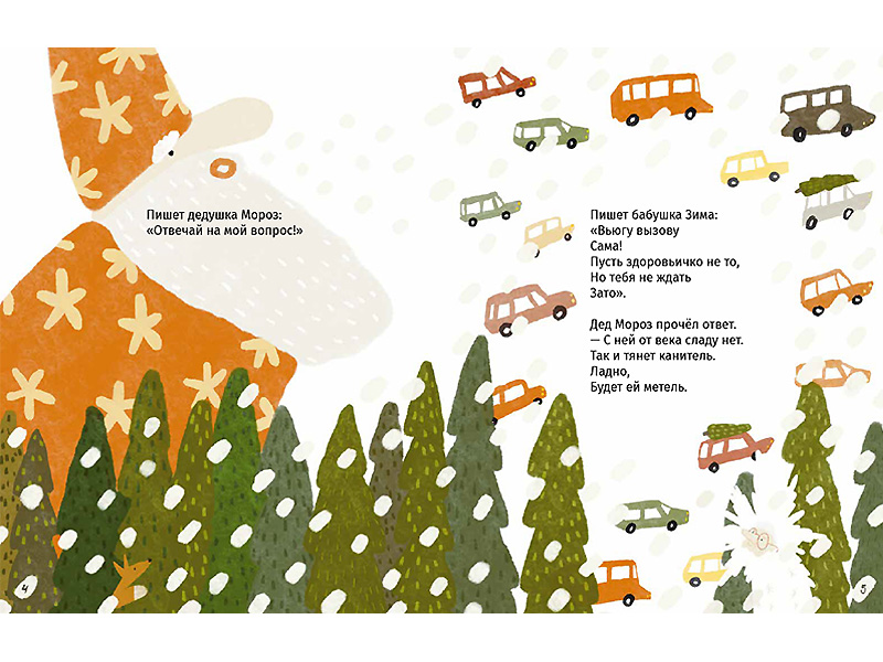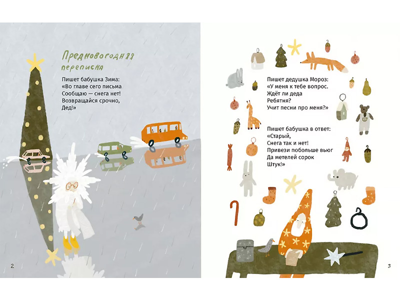 Если у Деда Мороза есть внучка Снегурочка, значит, у него и жена должна быть, – об этом задумываются многие пятилетки. Маша Рупасова откликается на эти детские фантазии – конечно, есть жена, а как же! Бабушка Зима! И придумывает бурную предновогоднюю переписку, где бабушка по-стариковски ворчит на деда, но читать без хохота это невозможно. Как и про зимний ужин, для которого снежная бабка лепит снежные котлетки, чтобы накормить снежного деда. А ведь примерно так и представляет себе ребенок-дошкольник. Когда свежеслепленный снеговик остается вечером во дворе, а дети уходят по домам ужинать, он же тоже должен что-то поесть. Снежные котлетки – это так понятно и легко себе представить!