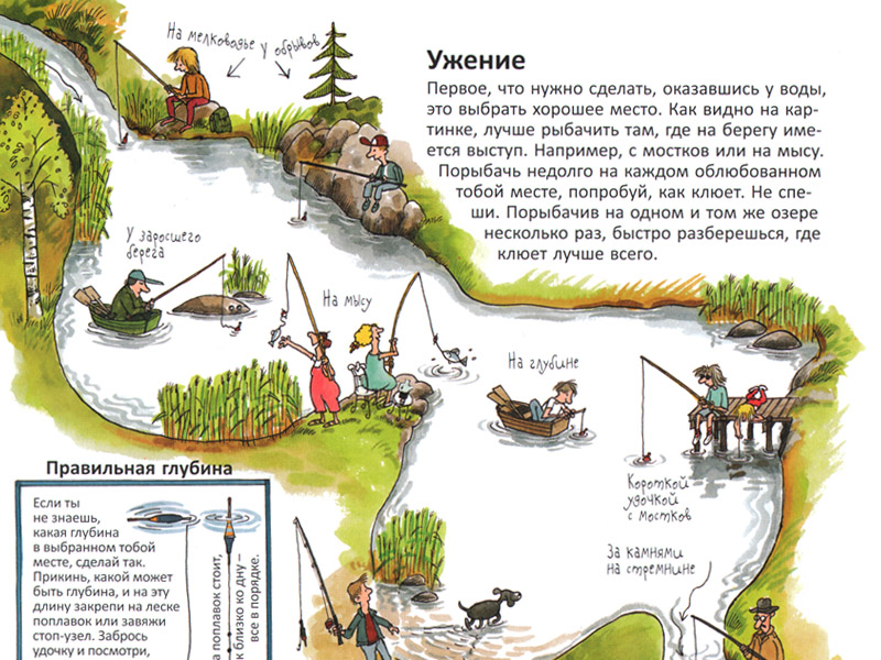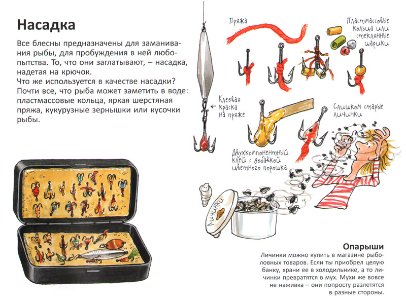 На мой женский взгляд, рыбалка – невероятно скучное занятие. Но автор и художник этой книги придерживаются противоположной позиции. Они показывают столько рыболовецких тайн и секретов, что после знакомства с этой книгой у маленького читателя буквально «чешутся руки». Скорее, скорее, где моя удочка? А если удочки нет, то надо срочно мастерить… ну хотя бы водный бинокль из обычных пластиковых ведерок. Через него можно смотреть на рыб под водой. Или поплавок из птичьих перьев. Или грузило из винтика.