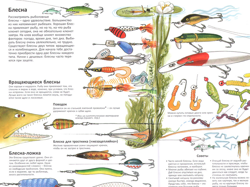 В «Книге для начинающих великих рыболовов» шесть основных глав. В каждой из них выделены тематические развороты: зачем нужные поплавки и крючки, как выбрать наживку, что такое спиннинг и блесна, как отличить щуку от плотвы. Иллюстрации здесь не менее значимы, чем текст, нередко именно они несут основную информационную нагрузку. Художник Каспер Вернер-Карлссон работает очень изобретательно. Он не только прорисовывает десятки видов крючков, поплавков или блёсен, но еще умудряется понятно и достоверно показать, как забрасывать спиннинг, как подсекать, вытаскивать добычу. В книге много рисованных схем, советов, рекомендаций.