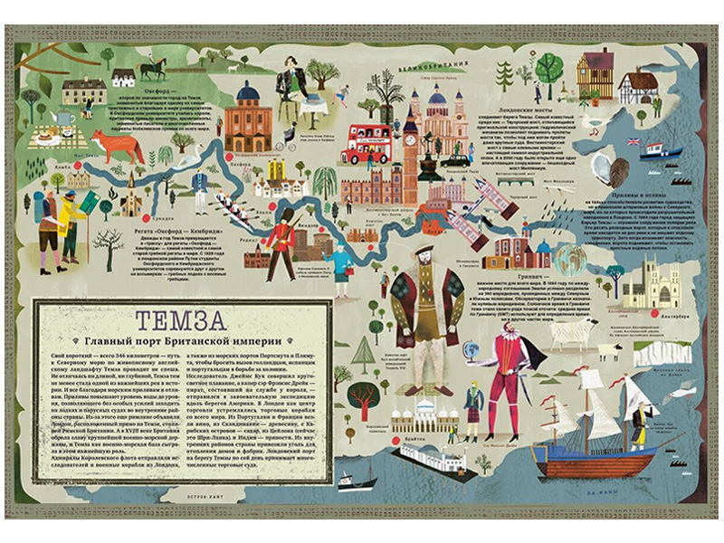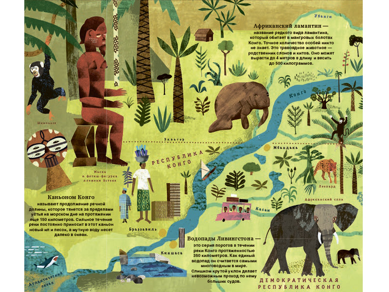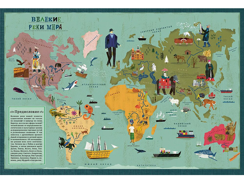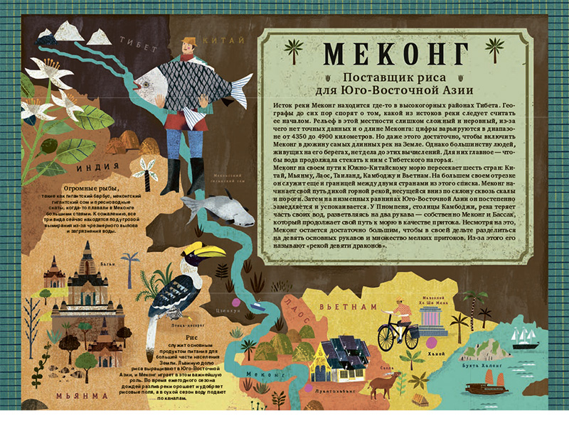 Каждый разворот посвящен одной из рек, которая повлияла на облик и экологию Земли. Всего их восемнадцать, среди них – Дунай, Нил, Амазонка, Рейн, Янцзы… Мы обратили внимание на то, что в книге о великих реках охвачены все континенты и в том числе подробно рассказывается о российских Волге и Лене. Это было приятно, тем более что о Волге мы не только читали, но и видели ее в поездках в нескольких городах – Ярославле, Угличе и Самаре.