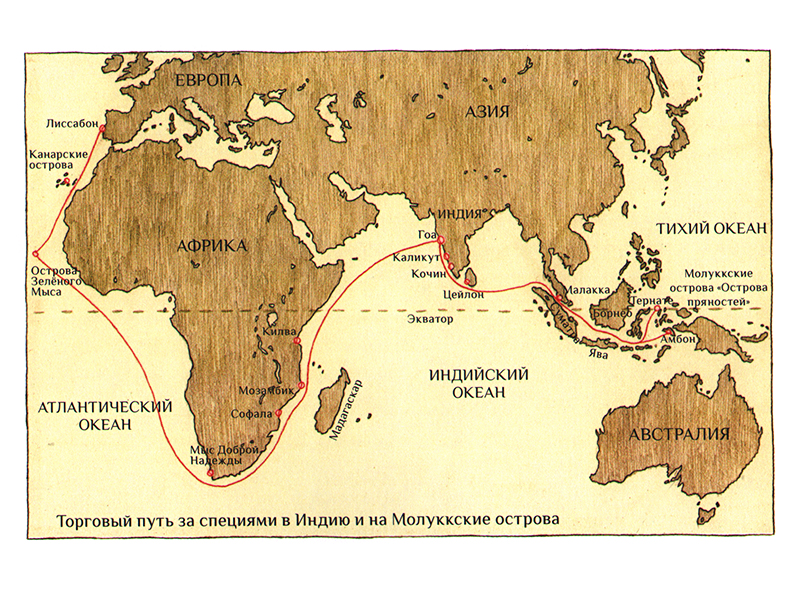 Он был ещё ребёнком, когда в Европе началась эра мореплавания. Все тогда стремились найти морской путь в Индию, чтобы получить прямой доступ к богатствам азиатского континента. И вот этот путь был проложен: из португальского Лиссабона корабли идут на юг мимо Канарских островов, пересекают экватор, огибают южное побережье Африки около мыса Доброй Надежды, идут вдоль юго-восточного побережья Африки, пересекают Индийский океан и, наконец, приходят в Индию. Индийские пряности и специи в Европе ценятся на вес золота и продаются за огромные деньги.