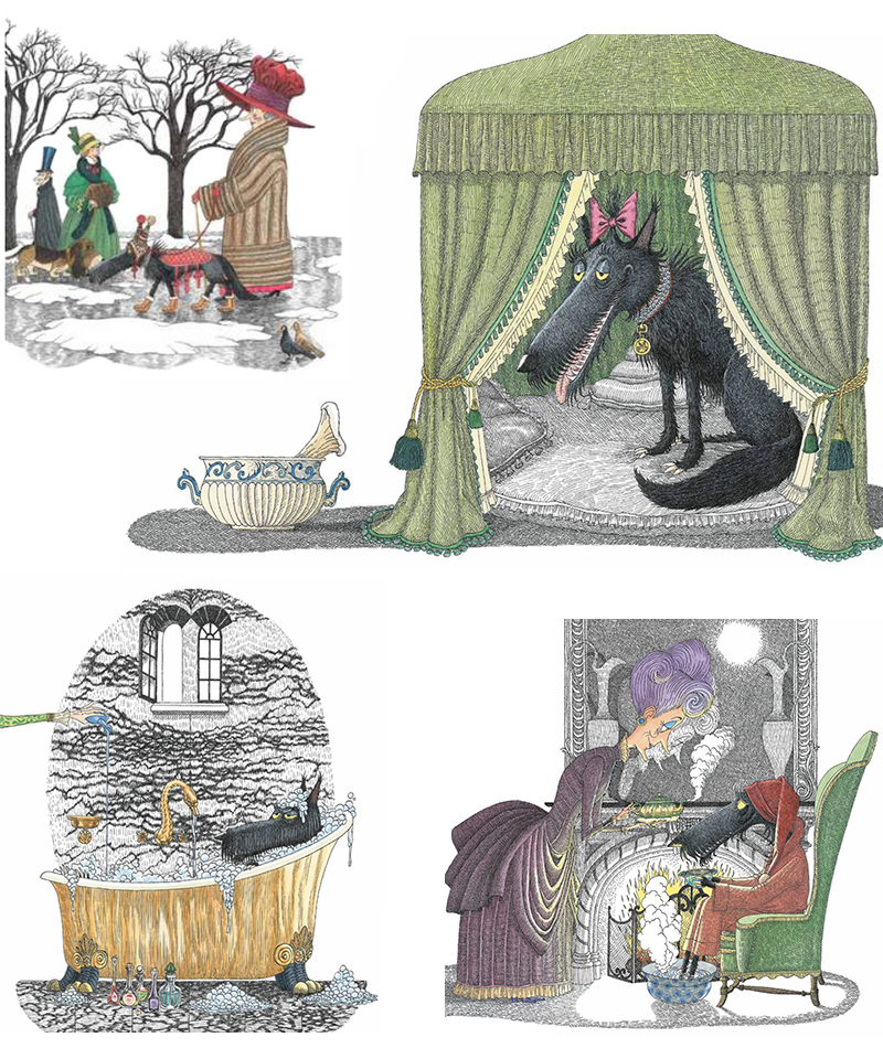 В книге очень интересные иллюстрации. Каждая страница – как отдельная история. Можно, например, рассматривать костюмы персонажей: все дамы в книге одеты в яркие, пышные и нарядные платья, на головах у них необычные шляпы с разноцветными перьями. У Медора есть модный зимний костюмчик – шапка со специальными прорезями для ушей и вязаные носочки на лапы; а его «причёску» украшают бантики – жёлтый, голубой или в клеточку. Ещё можно увидеть Медора, сидящего на подушке в тёплой кровати; или его же, одетого в ночной халат с колпаком. Мне понравилась иллюстрация, где Медор лежит в ванной с пышной пеной: вид у волка не слишком довольный.