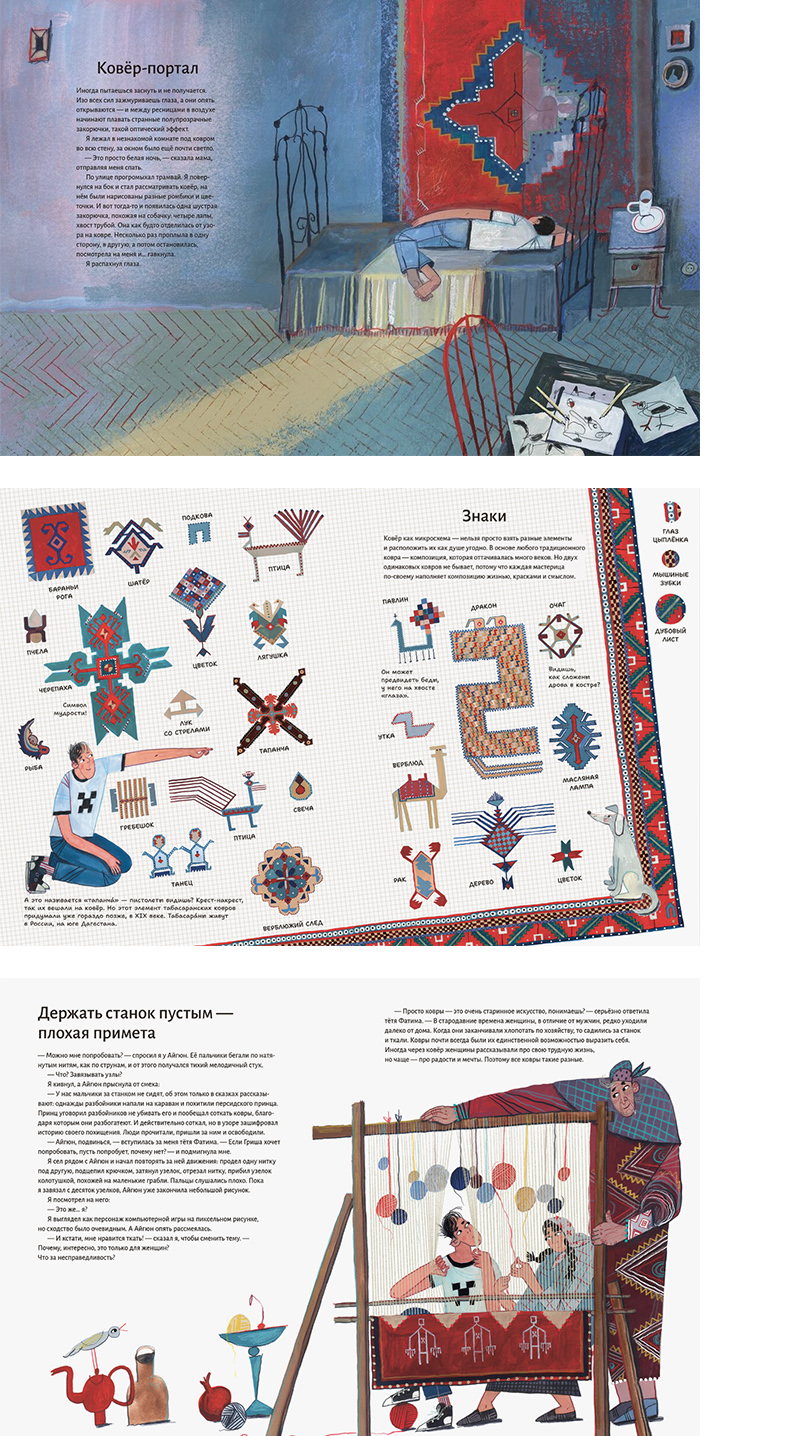 Целая улица Гранд-базара отдана коврам, про которые мы тоже не раз читали в сказках Шехерезады. В своей повседневной жизни Максим почти не встречается с коврами (разве что с ковриками в детском саду), поэтому мы внимательно изучили с ним книгу «Триста тысяч узелков» Елены Головановой. В ней подробно рассказывается о символике ковров, их производстве, о роли ковров в жизни тюркских народов. Макса поразило, что, оказывается, ковры можно читать как газеты или как книги. Правда, применить на практике полученные знания у него не вышло – турецкие ковры были украшены совсем другими узорами.