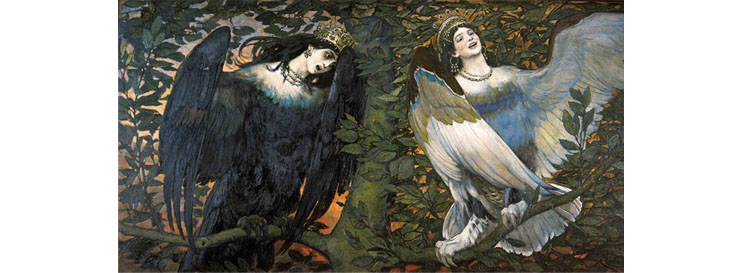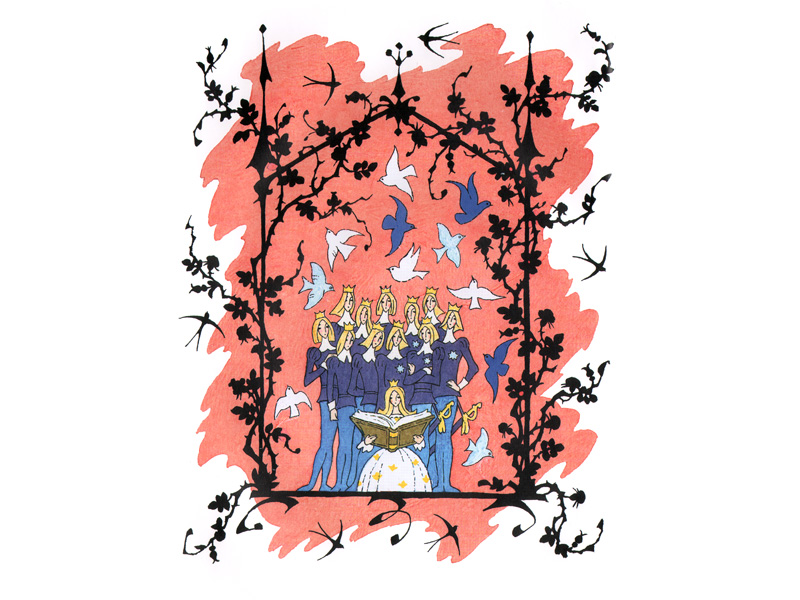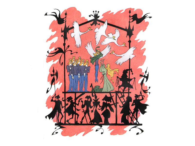 В этом контексте мы и начали читать «Диких лебедей». Сказку Андерсена мы читали в старом издании 1976 года, с иллюстрациями Эрика Булатова и Олега Васильева (совсем недавно оно было переиздано). Отличительная особенность этих иллюстраций в том, что среди них есть не только большие цветные сюжетные картинки – на каждом развороте на полях расположены еще и десятки маленьких силуэтных изображений, связь которых с текстом лишь ассоциативна. Зато разглядывать их можно бесконечно. Именно этим мы с Лёней и занимались после чтения. Лёня легко узнавал ворон, сов, ласточек, чаек и всех остальных пернатых.