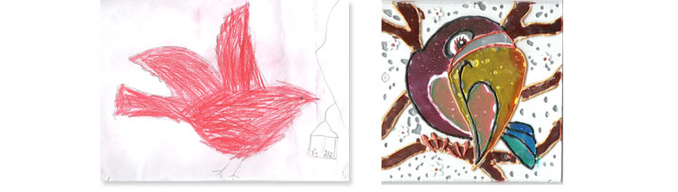 Еще мы с детьми говорили о том, что внутри у каждого человека живет птица-душа. И она может быть разной. Иногда она веселая – как чижик из стихотворения Маршака и Хармса «Жили в квартире сорок четыре сорок четыре веселых чижа…» Иногда грустная – как птица печали на картине Виктора Васнецова «Птица радости и птица печали». Дети сами выбирали себе образ своей души-птицы, рисовали на бумаге и на стекле, вырезали, складывали из бумаги, лепили.