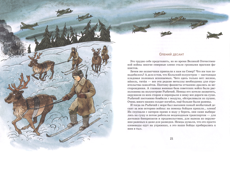 Последняя главка книги – «Олений десант» – выводит тему на новый уровень. Здесь рассказывается об участии оленей в Великой Отечественной войне – о том, как использовались олени и оленьи упряжки в битве за Север. Это уже просто захватывающее повествование в лучших традициях советской научно-популярной литературы. И заканчивается оно на красивой, высокой ноте: «В городе Салехарде благодарные люди поставили оленю памятник».