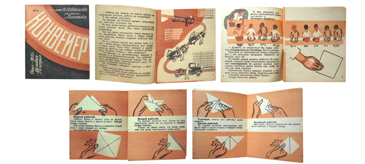 Автор книжек «Вертушка» и «Конвейер» Александр Абрамов после рассказа об автомобильном конвейере предлагал детям игру: сделать бумажную вертушку и мячик бригадным методом. Рассевшись за длинным столом, девять детей складывают одно изделие, каждый делает по одному сгибу, а последний надувает уже готовый бумажный шар. В метафорическом смысле «раздувание», соревнование, рекорды оказались знамением времени: проще загибать углы, чем научиться складывать бумажного чертика.