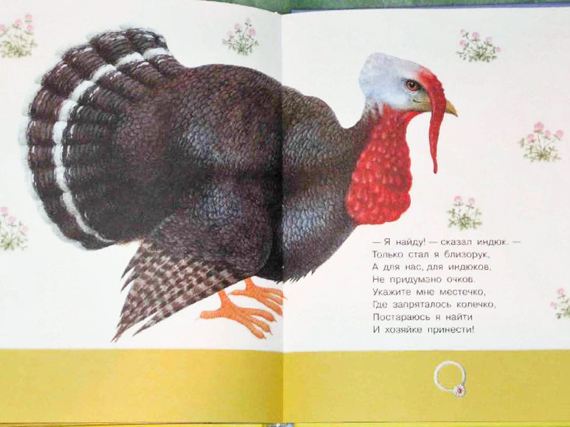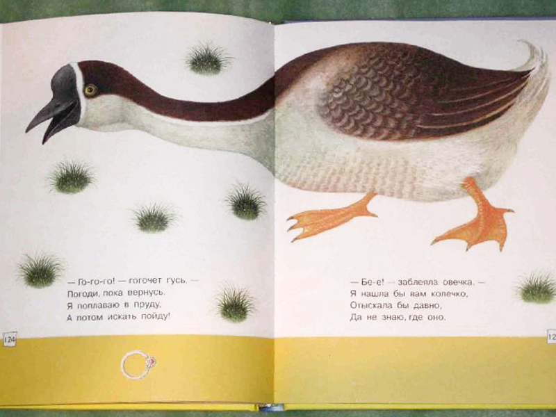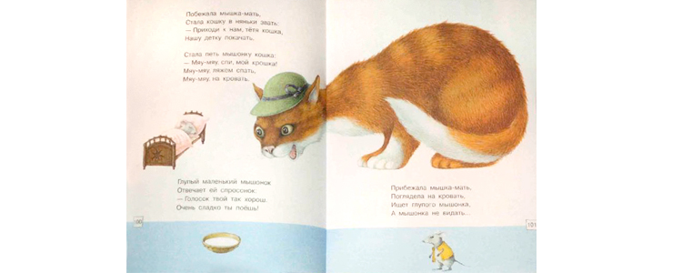И еще попутно мы повторили, чем питаются все животные из этой сказки. Как мы помним, мама-мышка предлагала сыну подкрепиться перед сном «хлебной коркой и огарочком свечи». Каждая новая няня пыталась накормить мышонка своим любимым лакомством: утка – червяком, жаба – комаром, лошадь – овсом. Художник нарисовал внизу каждой страницы угощение для мышонка, даже там, где в тексте оно не указано. Свинья принесла несколько желудей, курица – горсть гороха, щука – мелких рыбешек, кошка – блюдце молока.